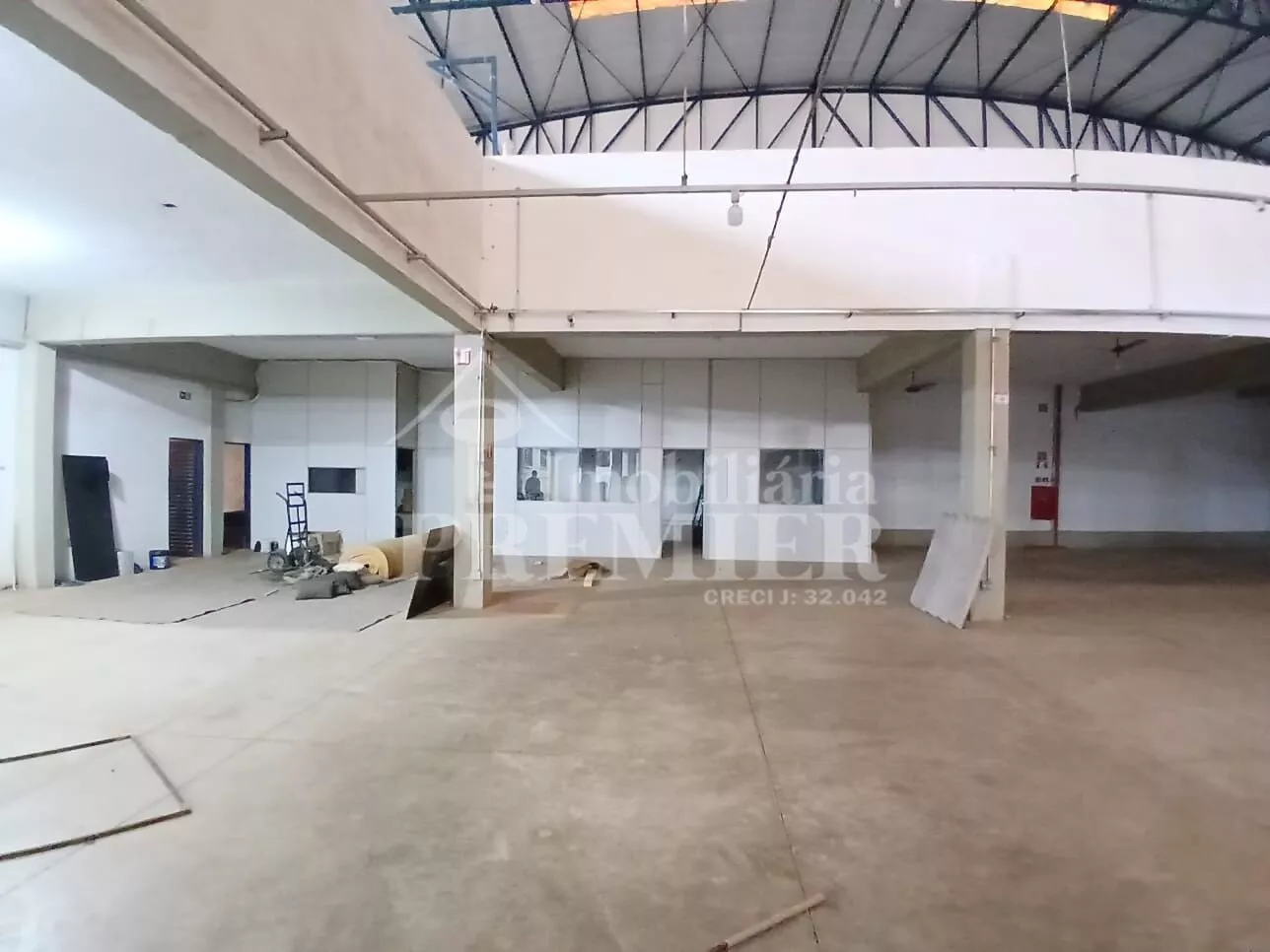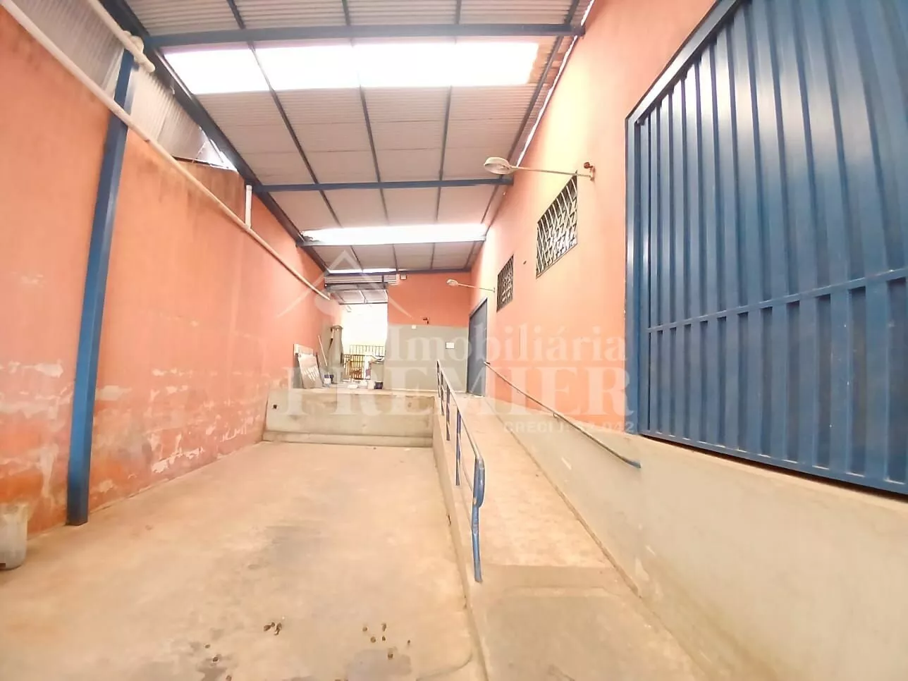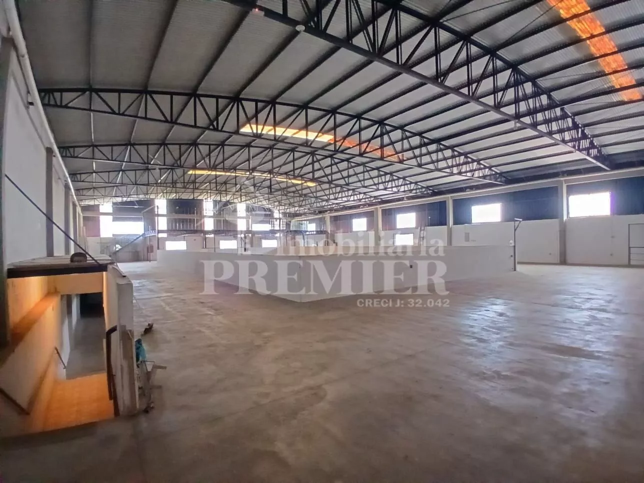 - Piso térreo: 01 salão com vão livre de 1.600 mts aproximadamente, com 01 cozinha com pia, 03 banheiros, sendo 02 coletivos, tipo vestiário masc e fem, 01 para cadeirante, 03 salas de escritório com janelas de vidro e ar condicionado + 01 salão grande de 300 mts2 aproximadamente, com 03 portas basculantes e 01 doca com plataforma para carga e descarga.