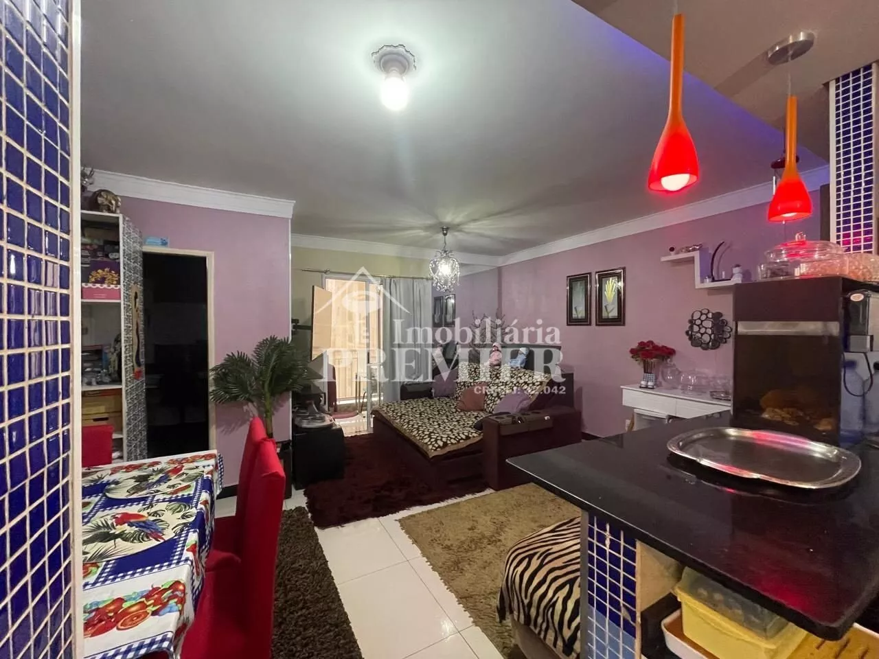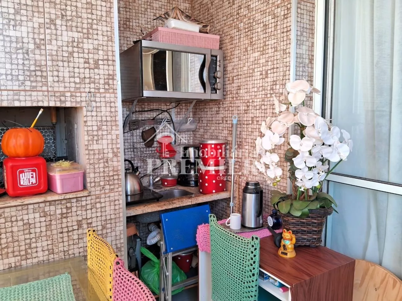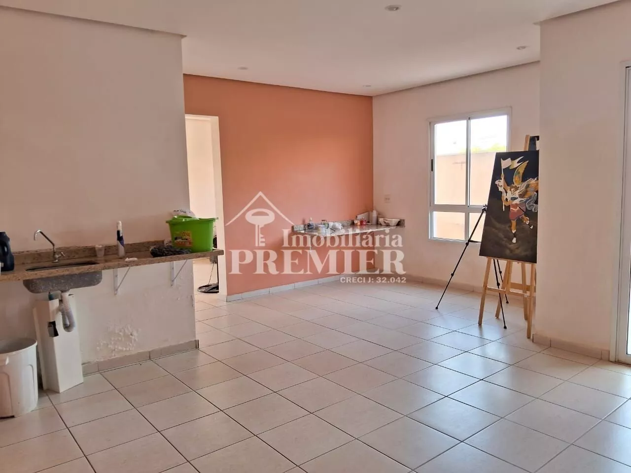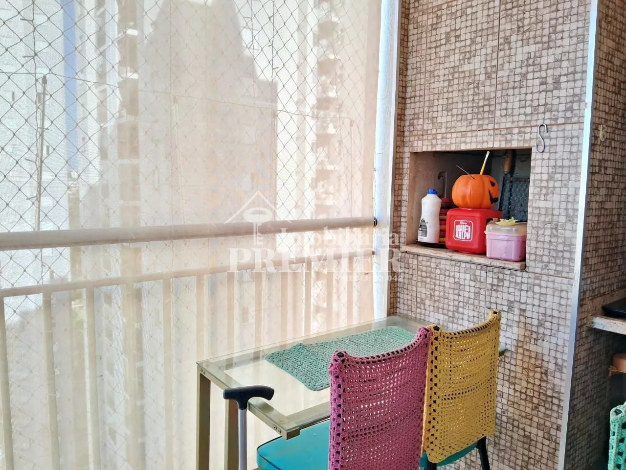 - 01 Sala com porta para sacada, com churrasqueira, pia e toldo;