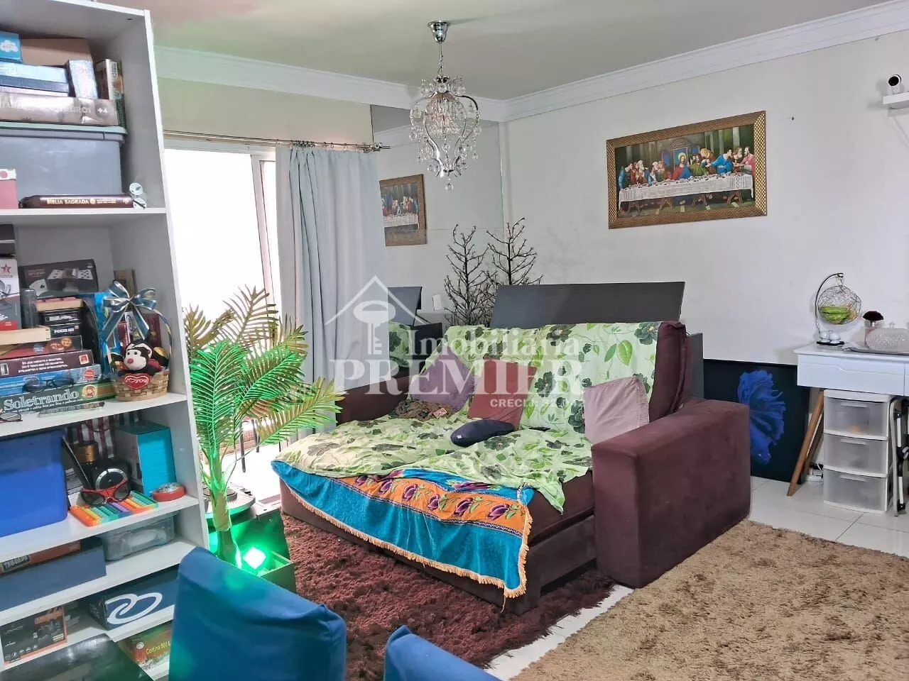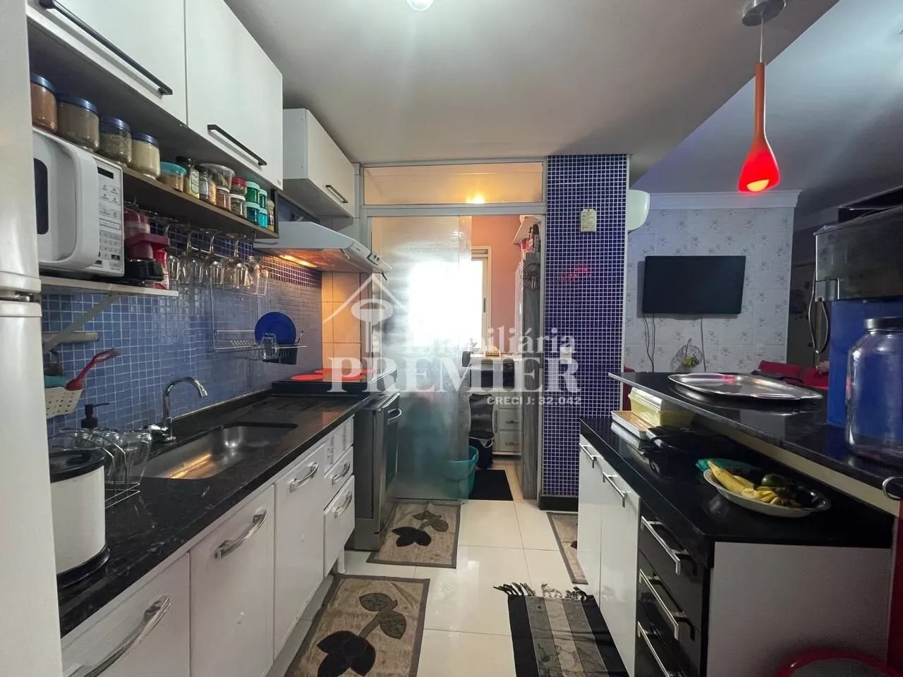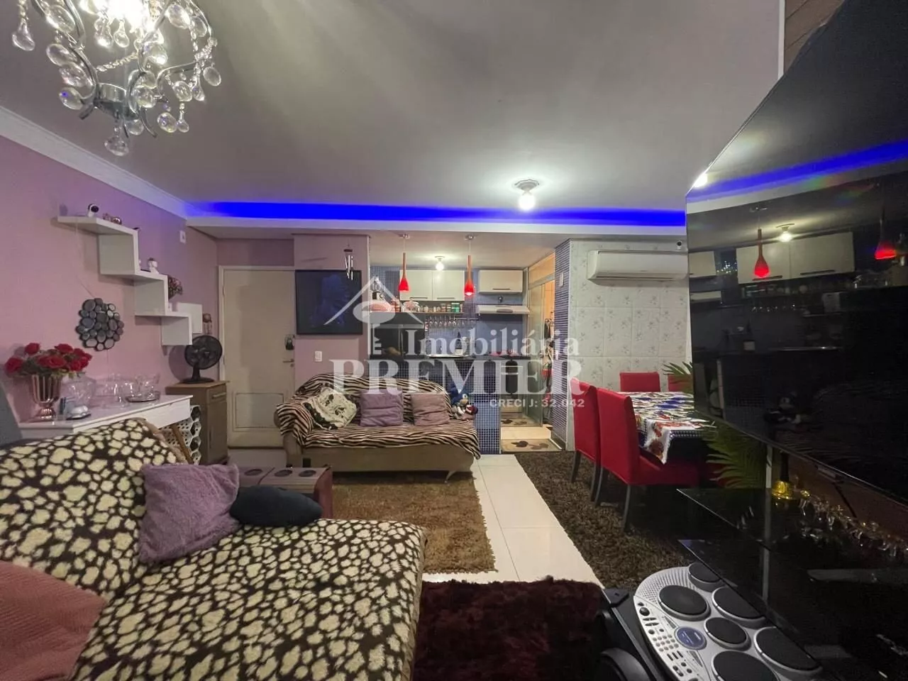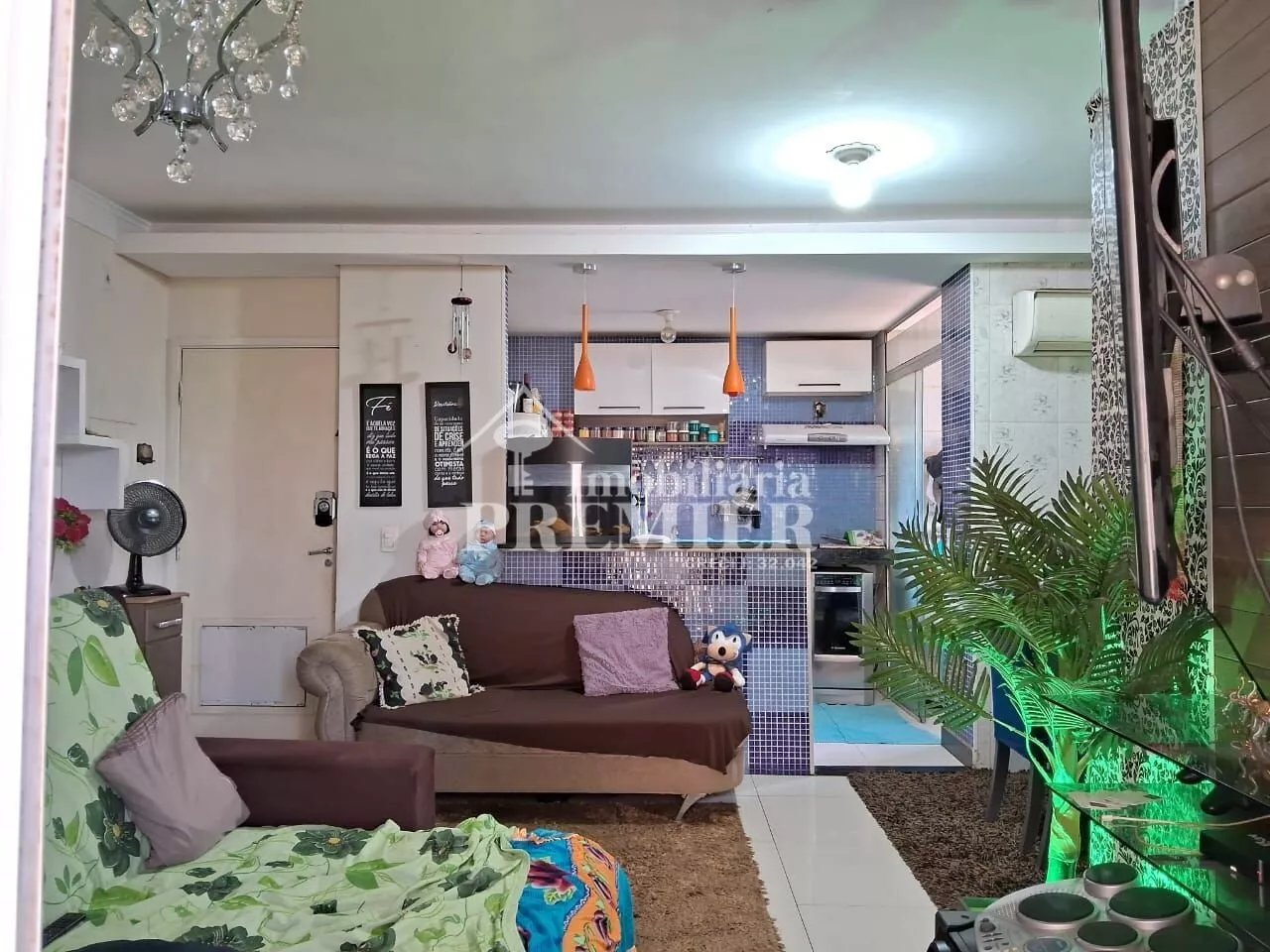 - 01 Sala com porta para sacada, com churrasqueira, pia e toldo;