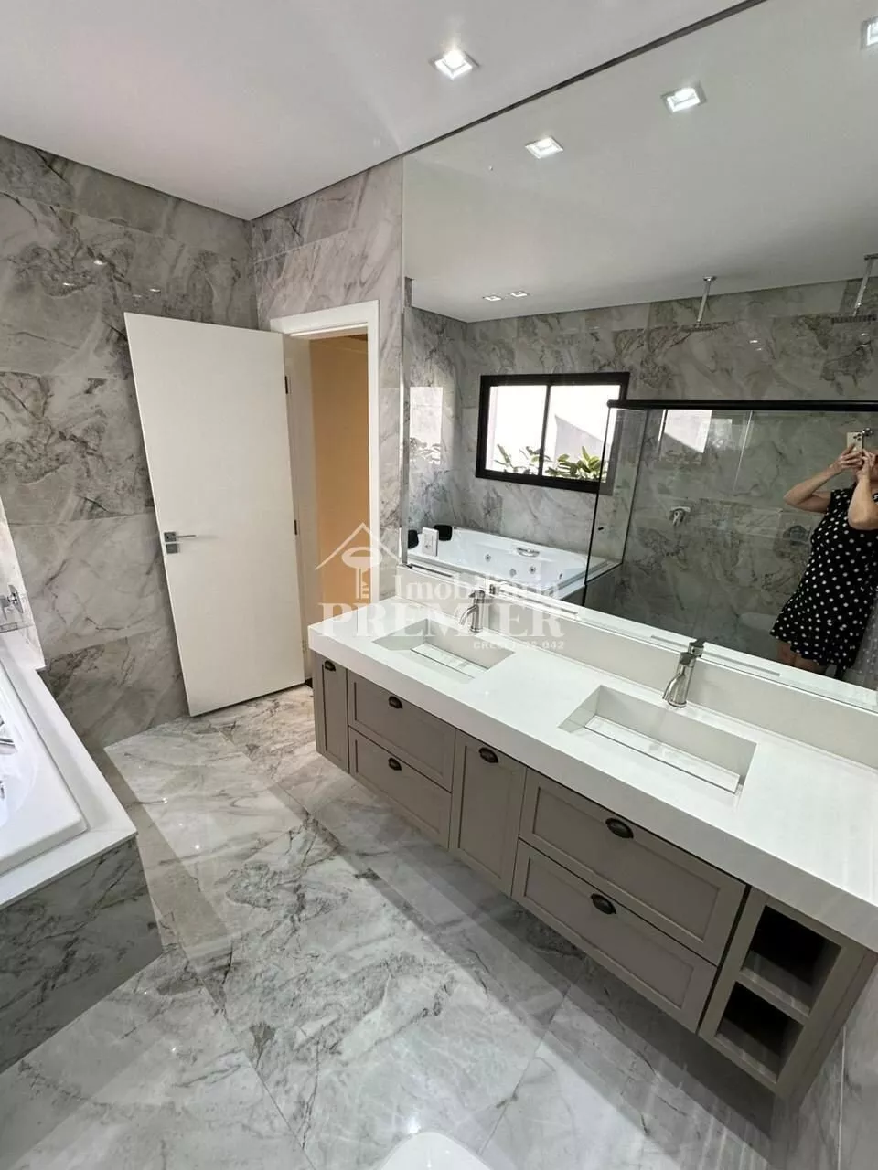 Dormitórios: 3 suítes, incluindo uma master com closet, duas duchas saindo do teto e duas cubas esculpidas no primer branco