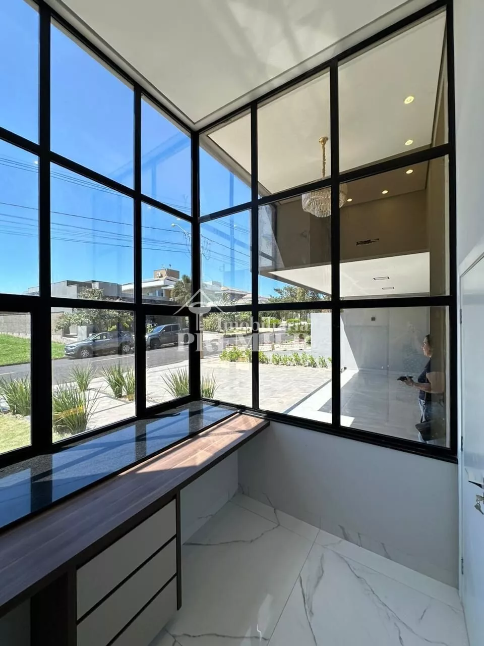 Detalhes: Todas as pias, ilha e bancadas com cubas esculpidas no mármore primer branco, esquadrias na cor preta