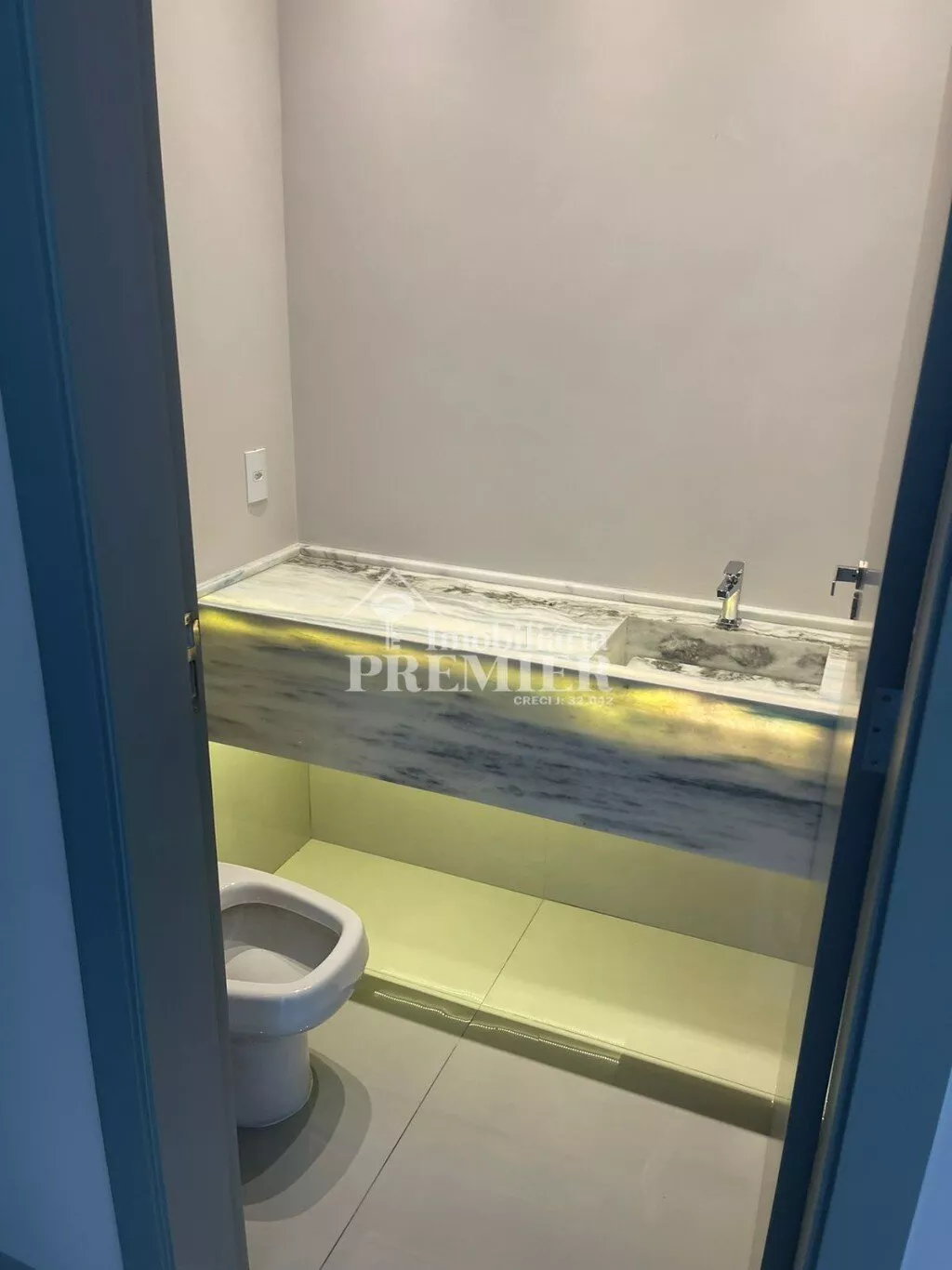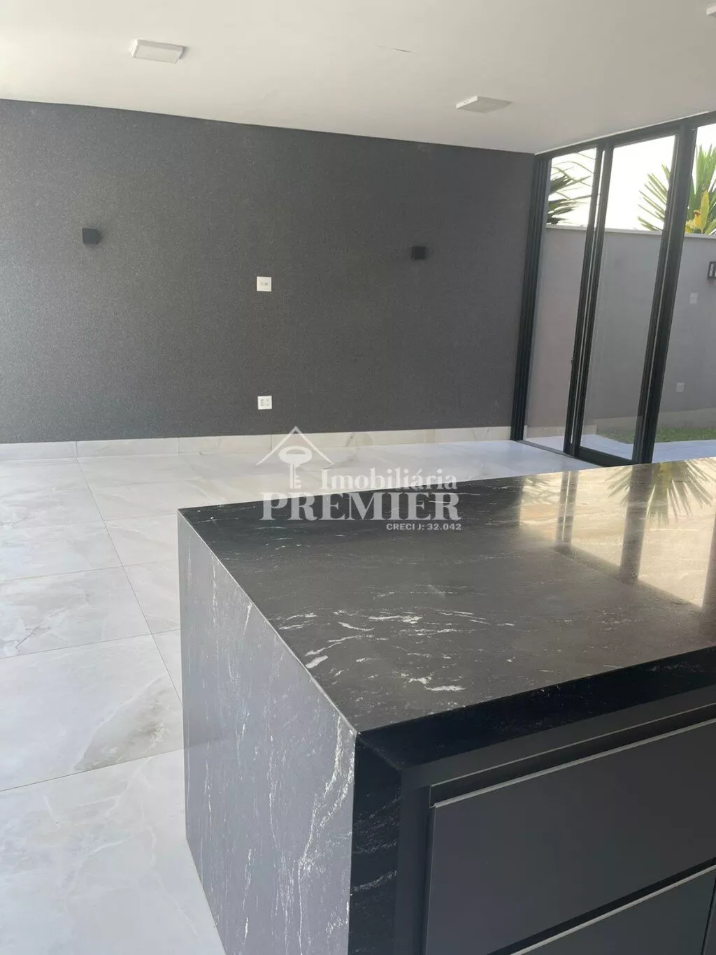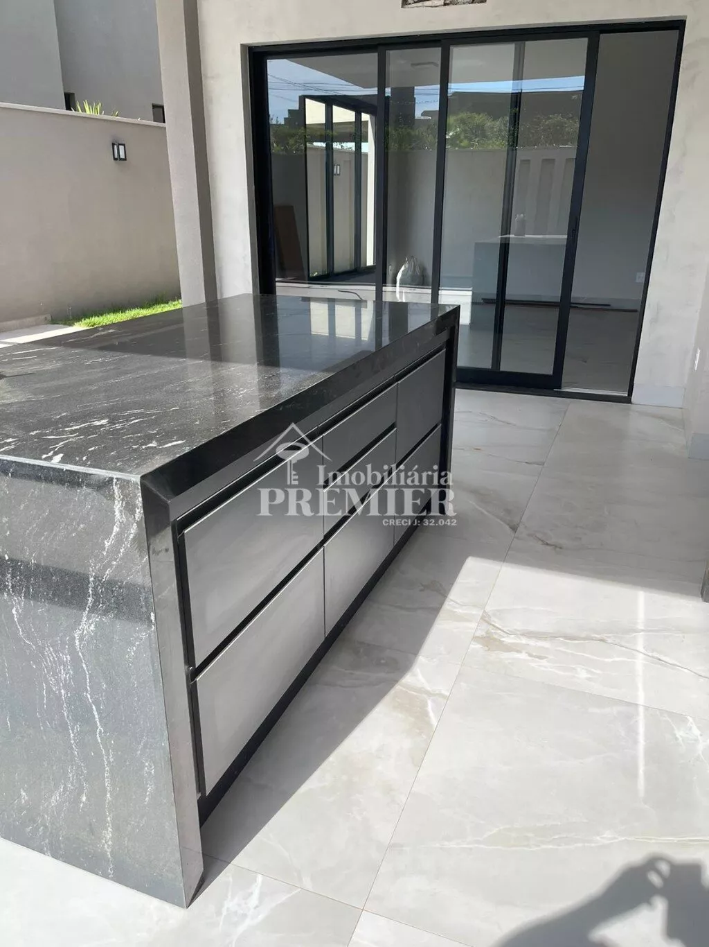 - Sala gormet com pia e armários, ilha grande com pia, balcão e armários, churrasqueira, porta de vidro para área de laser;